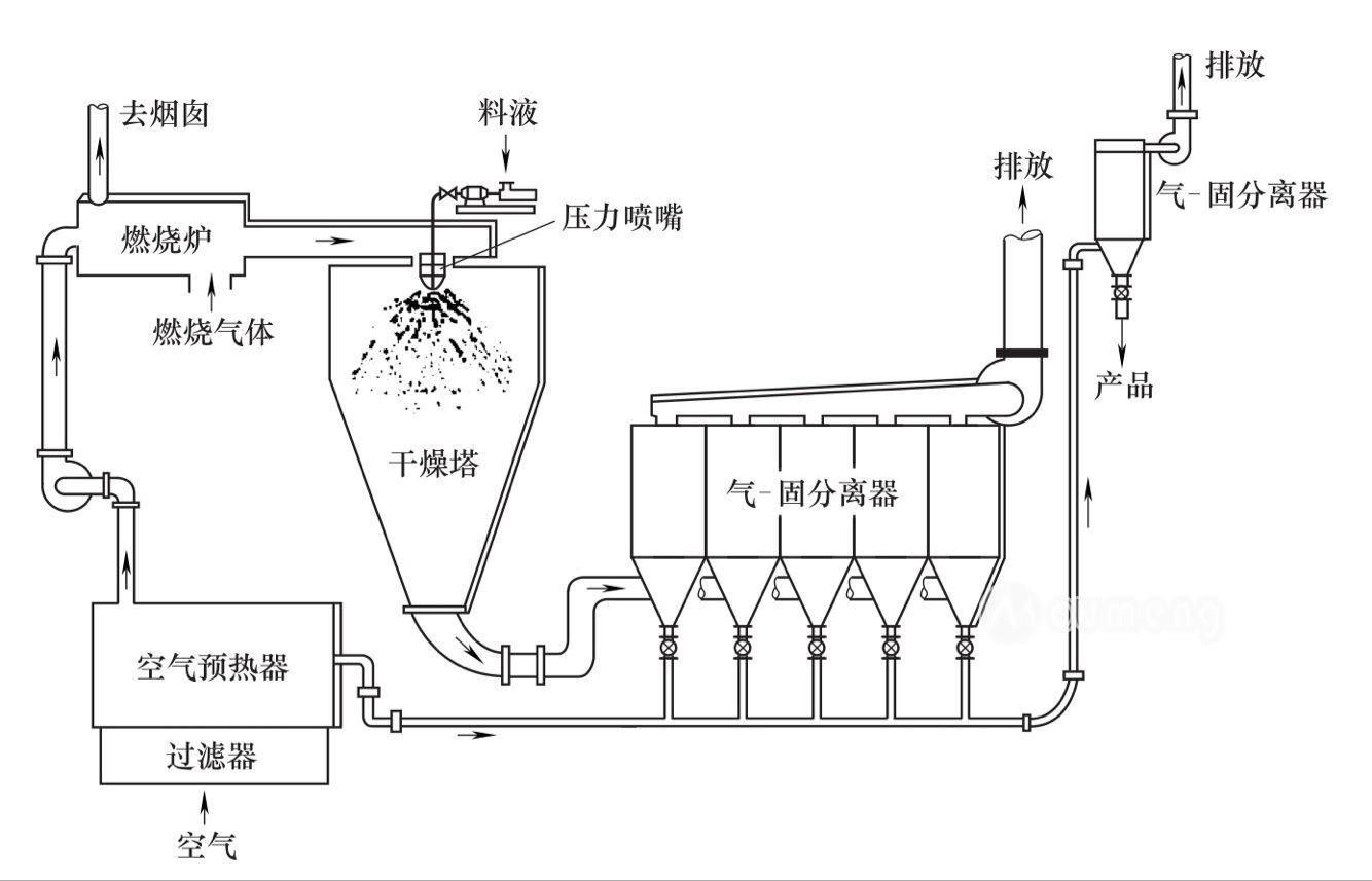 所謂噴霧干燥機開式循環流程,就是采用的干燥介質是空氣,干燥完成以后,廢氣排放到大氣中。